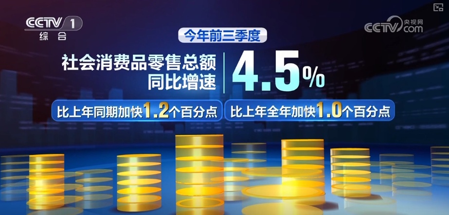 央视新闻:2025年以来,随着一系列促进消费政策措施的实施,消费新业态、新模式、新场景不断拓展,消费潜力不断释放,消费市场实现稳定增长。这是2025年前三季度社会消费品零售总额同比增速,为4.5%。这一增速比去年同期和去年全年分别加快1.2个和1.0个百分点,反映出市场销量的稳步增长。国家信息中心经济预测部宏观经济研究实验室副主任邹云汉表示,2025年前三季度,我国消费呈现稳定强劲上升态势,政策红利不断释放,商业模式创新按下“加速键”,进一步激发了消费热情和活力。f消费更好地满足了人民群众的安全需求。多样化、高质量的消费者更新。 2025年起,服务消费将加速增长。前三季度,服务业零售额同比增长5.2%,增速比1-8月加快0.1个百分点,比同期商品零售额加快0.6个百分点。其中,文化体育休闲服务、通信信息服务、交通运输服务零售额实现两位数增长。以旧换新政策持续落实,相关产品零售额快速增长。前三季度,大家具品类规模同比增长21.3%,延续2025年以来最快增长态势。消费电子、视听器材、文化办公用品零售额同比分别增长25.3%和19.9%,增速明显快于去年同期和去年全年。 2025年起,新消费增长加快,线上消费持续向好。前三季度网络零售额同比增长9.8%,增速比1-8月加快0.2个百分点。 5月份以来,增速持续加快,网络消费对社会消费品零售整体增长的拉动作用不断增强。 1-3月最终消费支出对经济增长的贡献率达53.5%,比上年提高9.0个百分点,继续发挥经济增长主引擎作用。