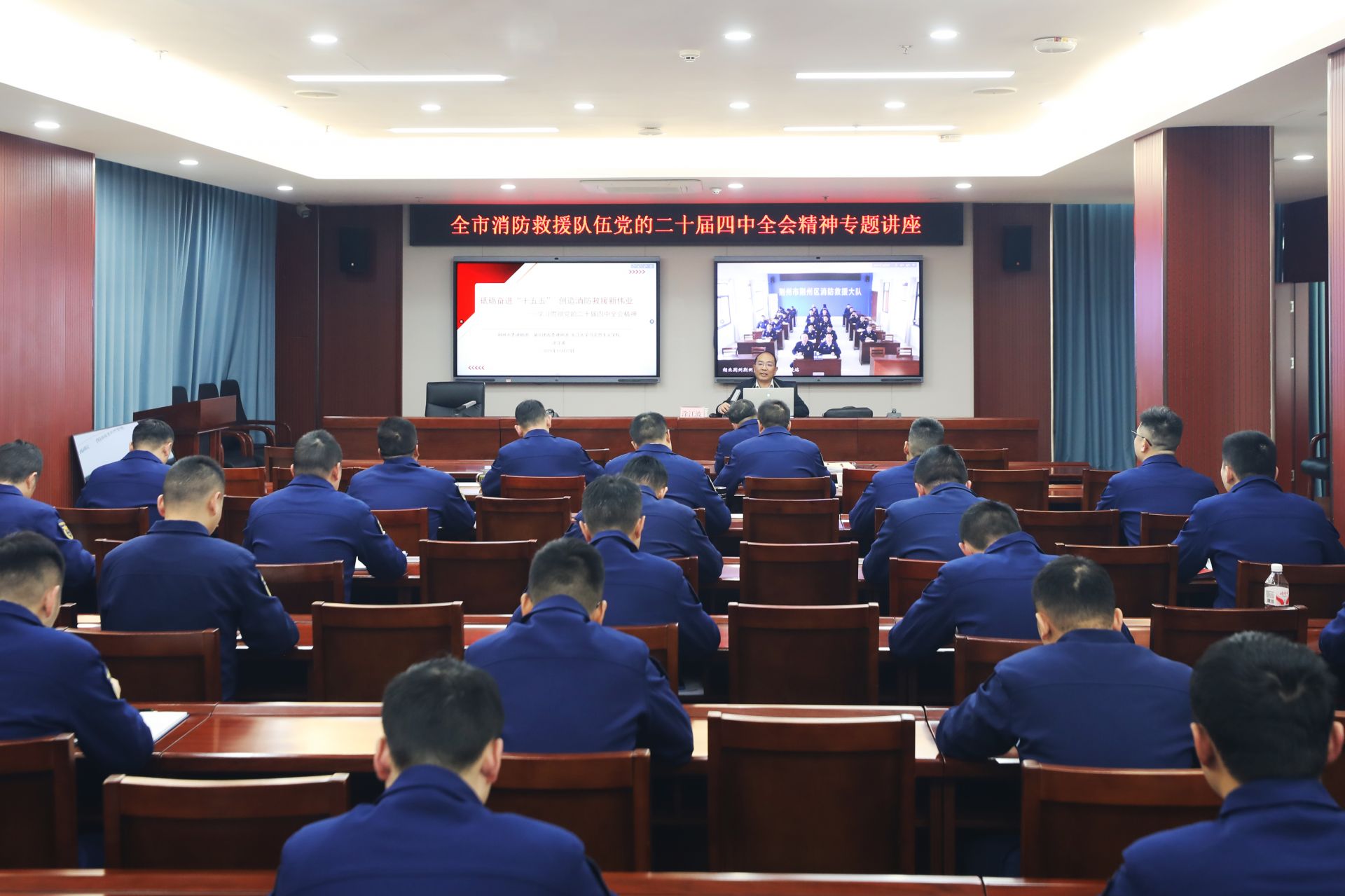 荆中网讯(湖北日报)(通讯员 张崇辉 田田 通讯员)11月27日,荆州支队邀请荆州市委宣讲团成员、长江大学马克思主义学院涂江波教授做中共二十届中央四次大会精神专题讲座。支队委员和除值班人员外的全体消防救援人员在家参加学习。